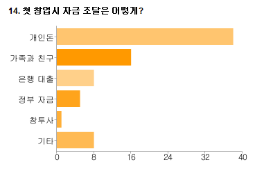 첫 창업시 자금 조달은 개인돈 또는 가족/친구로 부터 받은 종자돈으로 해결한 경우가 70%가 넘는다. 역시 아직 우리나라의 엔젤투자는 갈길이 멀다.