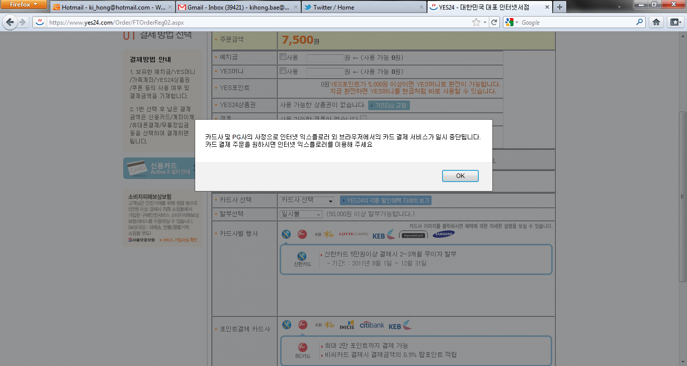 일단 이북 독서를 위해 최적화되어 있는 iPad용 YES24 이북 전용 리더가 없다는 점에 매우 실망했다. 갤럭시탭용 이북 리더는 있으면서 아이패드 앱이 없다는게 이해하기 힘들었지만, 뭐 한국이니까 그렇겠지 하고 아이폰용 YES24 앱을 설치 하고 이 앱을 통해서 이북을 구매해봤다. 경험은 그닥 나쁘지 않았다. 아니, 결제하기 전까지의 경험은 그닥 나쁘지 않았다. 신용카드 결제를 하려고 보니 사용가능한 카드가 ‘BC카드’ ‘국민 카드’ ‘삼성카드’ 등 국내 카드 몇가지 밖에 없었다. 심지어는 내가 가지고 있는 유일한 한국 카드인 ‘외환 마스터카드’도 카드 리스트에 없었다. “이런 제기랄…역시 이런식으로 밖에 못 만드는구나” 라는 생각이 머리를 스쳐갔다.